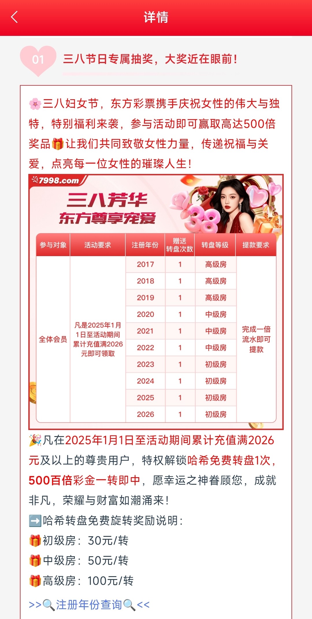 在2025年1月1日-活动至今累计存款有2026以上才能领取转盘机会,账号年份越久次数越多,获得的彩金1倍流水出款
