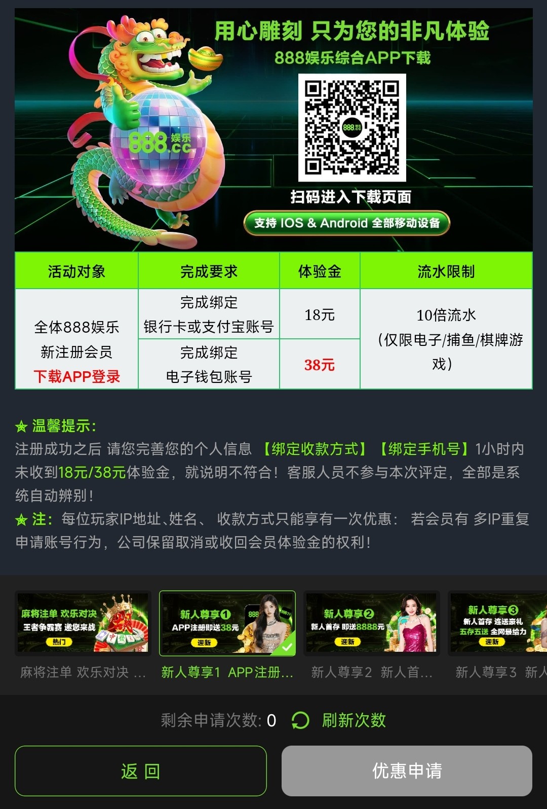 之前就有发过属于老白菜了,下载APP注册绑定银行卡/支付宝得18彩金或绑电子钱包得38彩金,二选一,10倍流水,仅限娱乐电子/棋牌/捕鱼