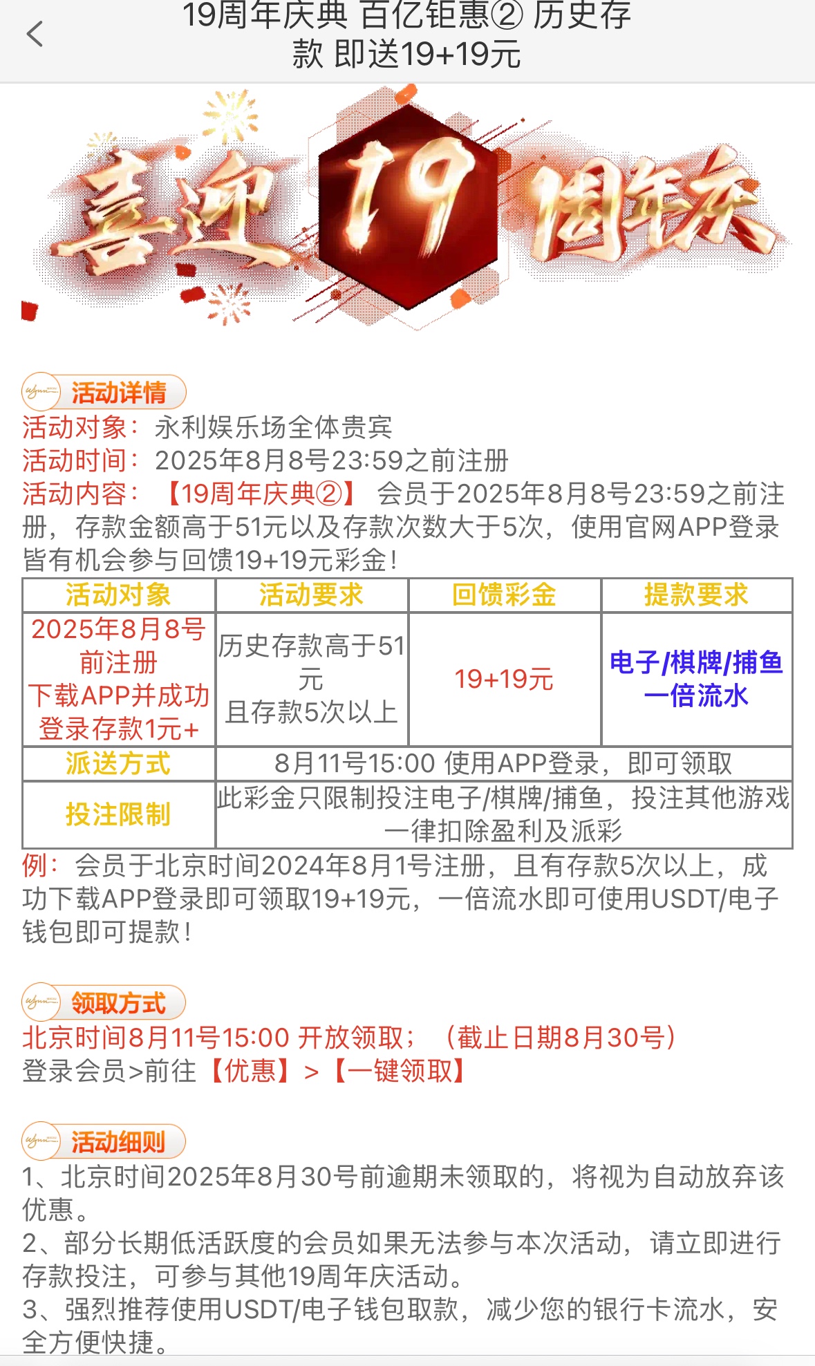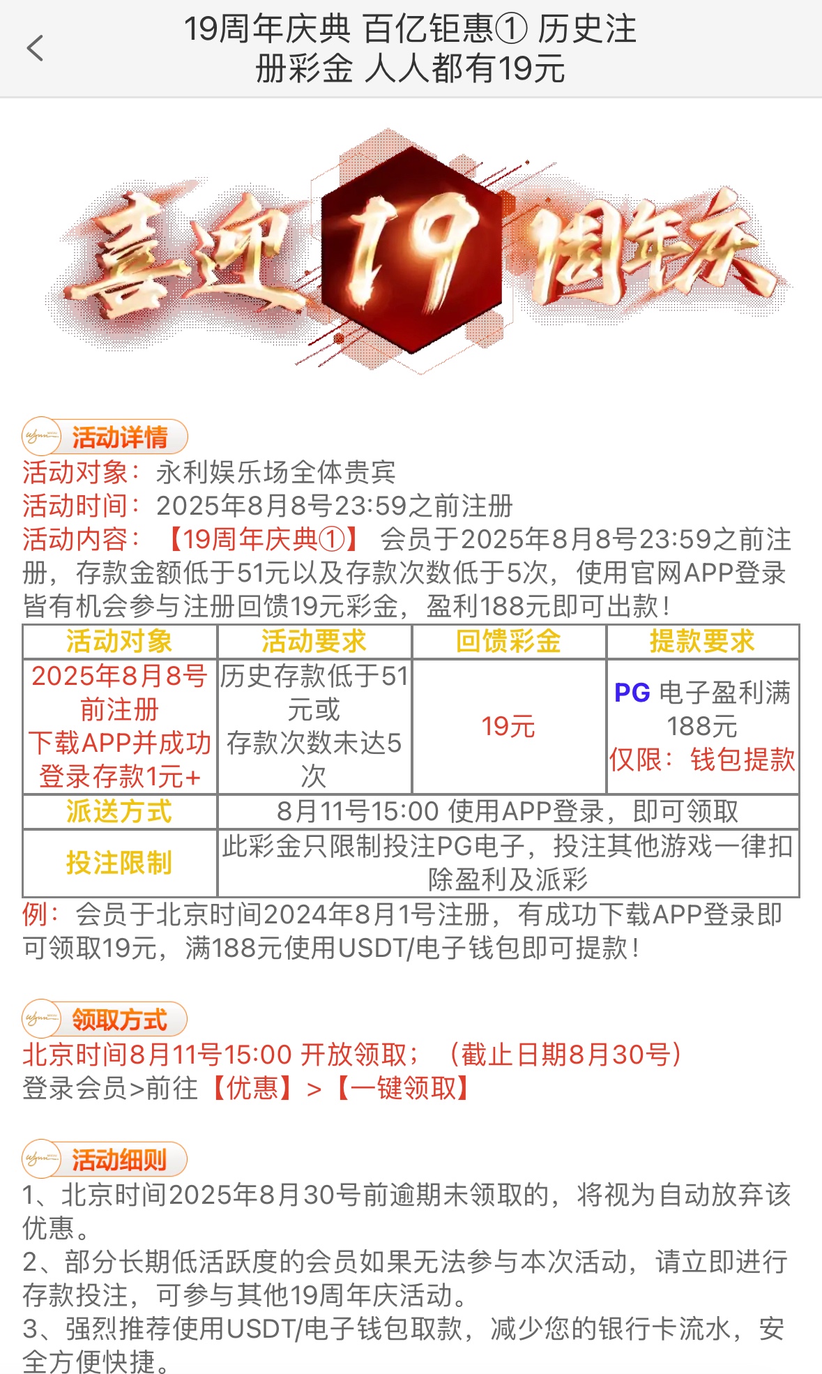 在8月8号之前注册存款低于51,存款低于5次下载APP登入领取19回馈彩金,仅限:PG电子,盈利到188取款,仅限:钱包取款
